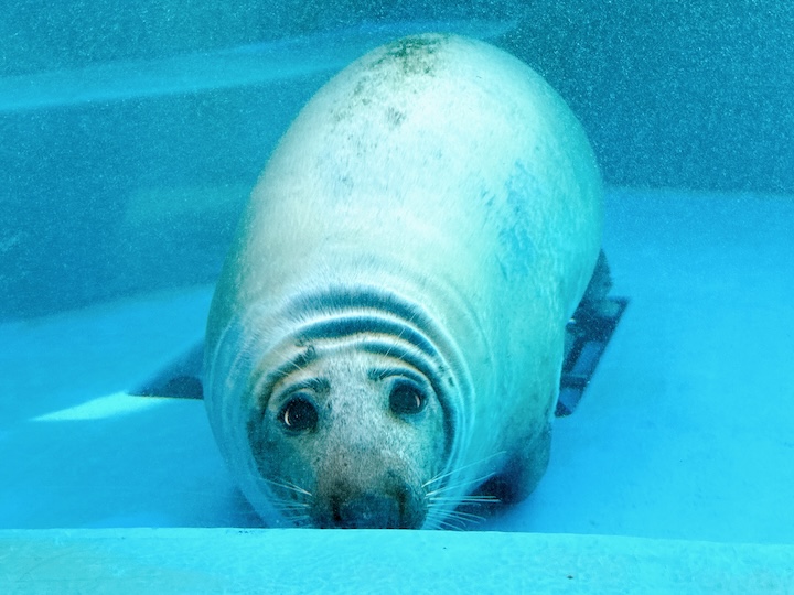 なんとも言えない表情で見つめてくるゴマフアザラシ。