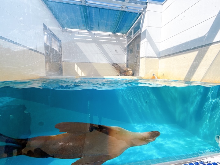 海獣の王国ではアシカやアザラシが自由に泳いだり寝そべったりしています。