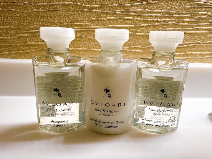 シャンプー、コンディショナー、ボディソープはブルガリ。